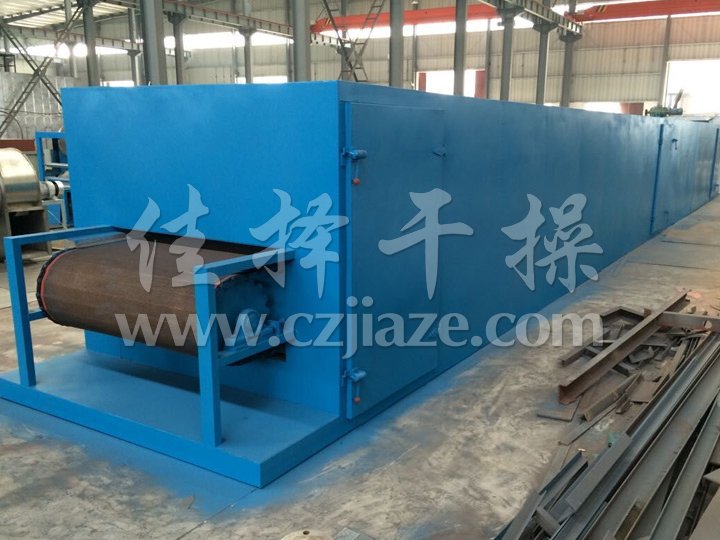 物料由加料器均勻地鋪在網(wǎng)帶上,網(wǎng)帶一般采用12-60目不銹鋼絲網(wǎng),由傳動(dòng)裝置拖動(dòng)在干燥機(jī)內(nèi)移動(dòng)。干燥機(jī)由若干單元組成,每一單元熱風(fēng)獨(dú)立循環(huán),部分尾氣由專門排濕風(fēng)機(jī)排出,廢氣由調(diào)節(jié)閥控制,熱氣由下往上或由上往下穿過鋪滿物料的網(wǎng)帶完成熱量與質(zhì)量傳遞的進(jìn)程,帶走物料水份。網(wǎng)帶緩慢移動(dòng),運(yùn)行速度可根據(jù)物料溫度自由調(diào)節(jié),干燥后的成品連續(xù)落入收料器中。上下循環(huán)單元根據(jù)用戶需要可靈活配備,單元數(shù)量亦可根據(jù)需要選取。
